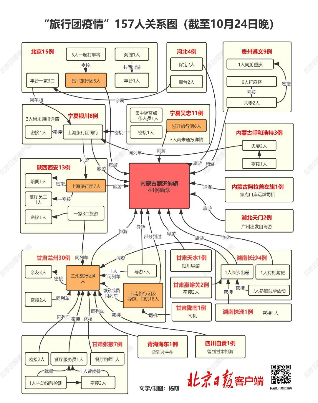 除内蒙古二连浩特的14名病例,和河北石家庄的1名病例尚未找到源头外,其余阳性病例都直接或间接与内蒙古额济纳旗相关,累计157人。