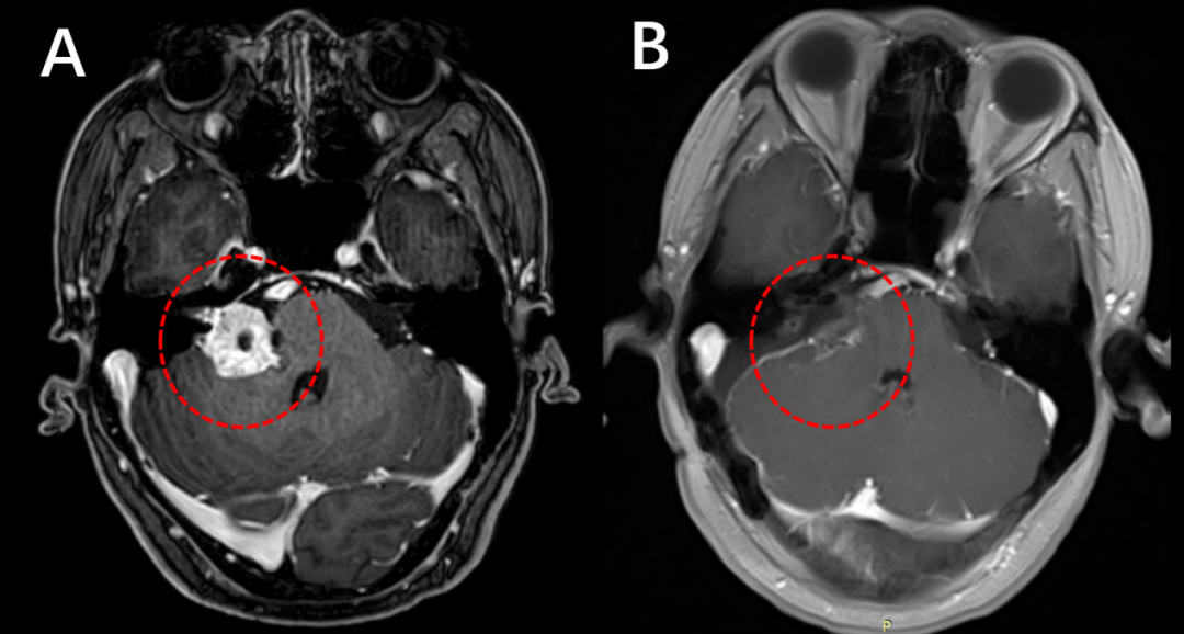 术前(左)和术后(右)增强磁共振检查,对比提示肿瘤完全切除(红色圈内的肿瘤消失)