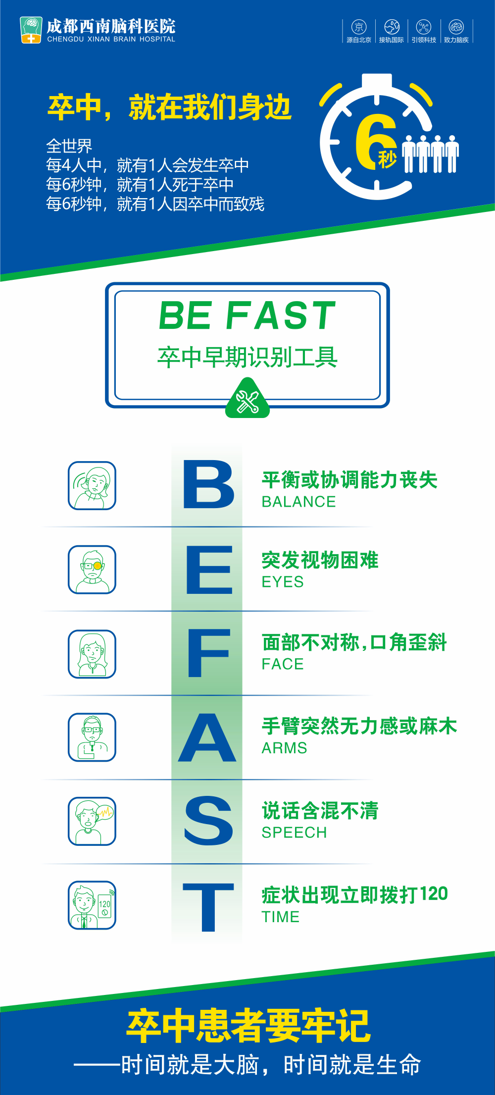 想要抢时间,牢记“BE FAST”口诀进行判断,也可以记一个 更简单的:言语含糊嘴角歪,胳膊不抬奔医院。